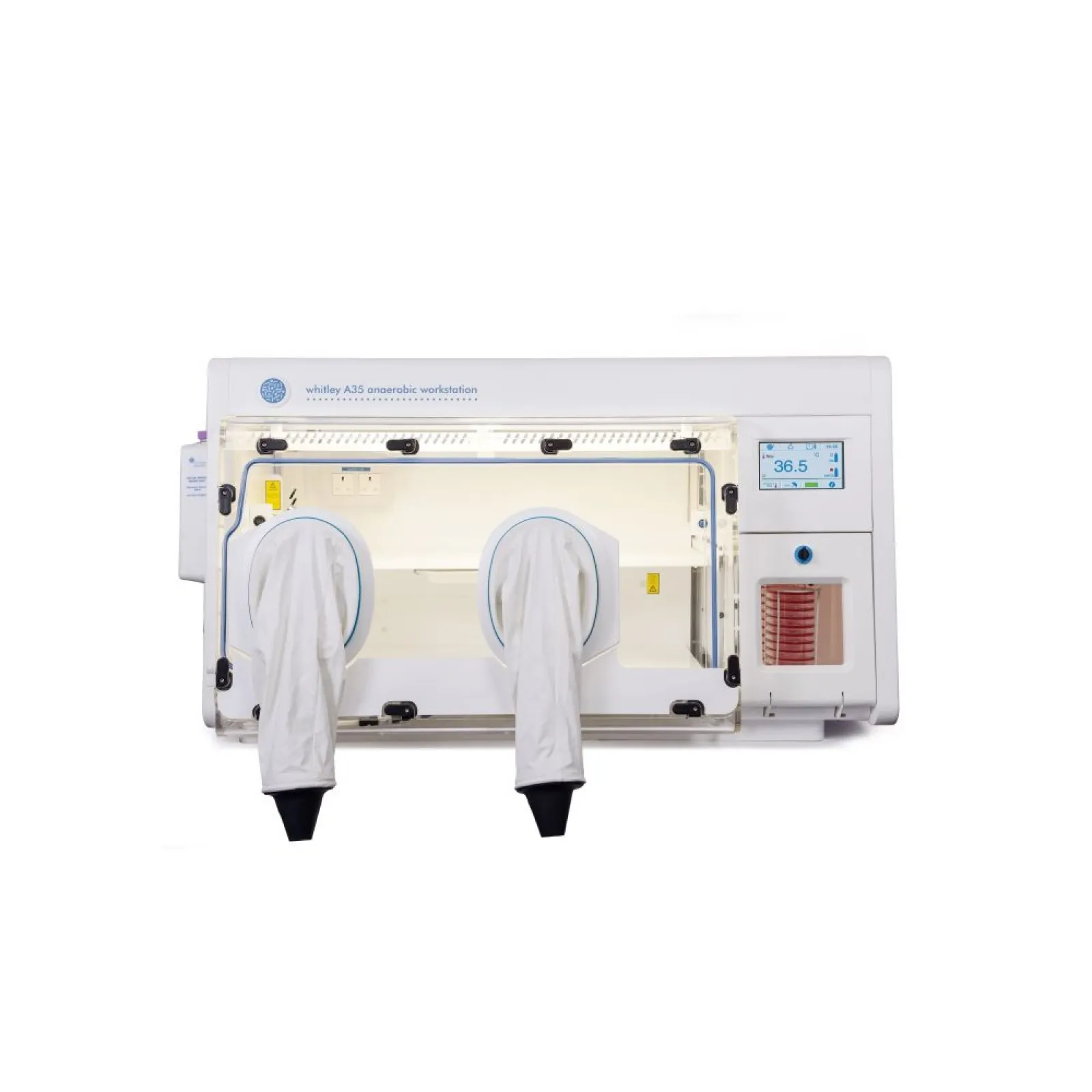 The standard A35 features two oval, sleeved ports on a fixed front. This workstation can also be specified with our unique instant access porthole system that allows entry to the chamber in seconds and needs neither gloves nor sleeves. Additional options include HEPA filtration, an integrated anaerobic conditions and catalyst monitoring system with data download facility.
